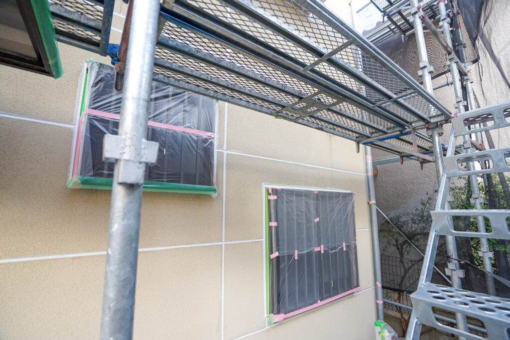 塗装をしない窓サッシやポストなどを、ビニールで覆う作業です。